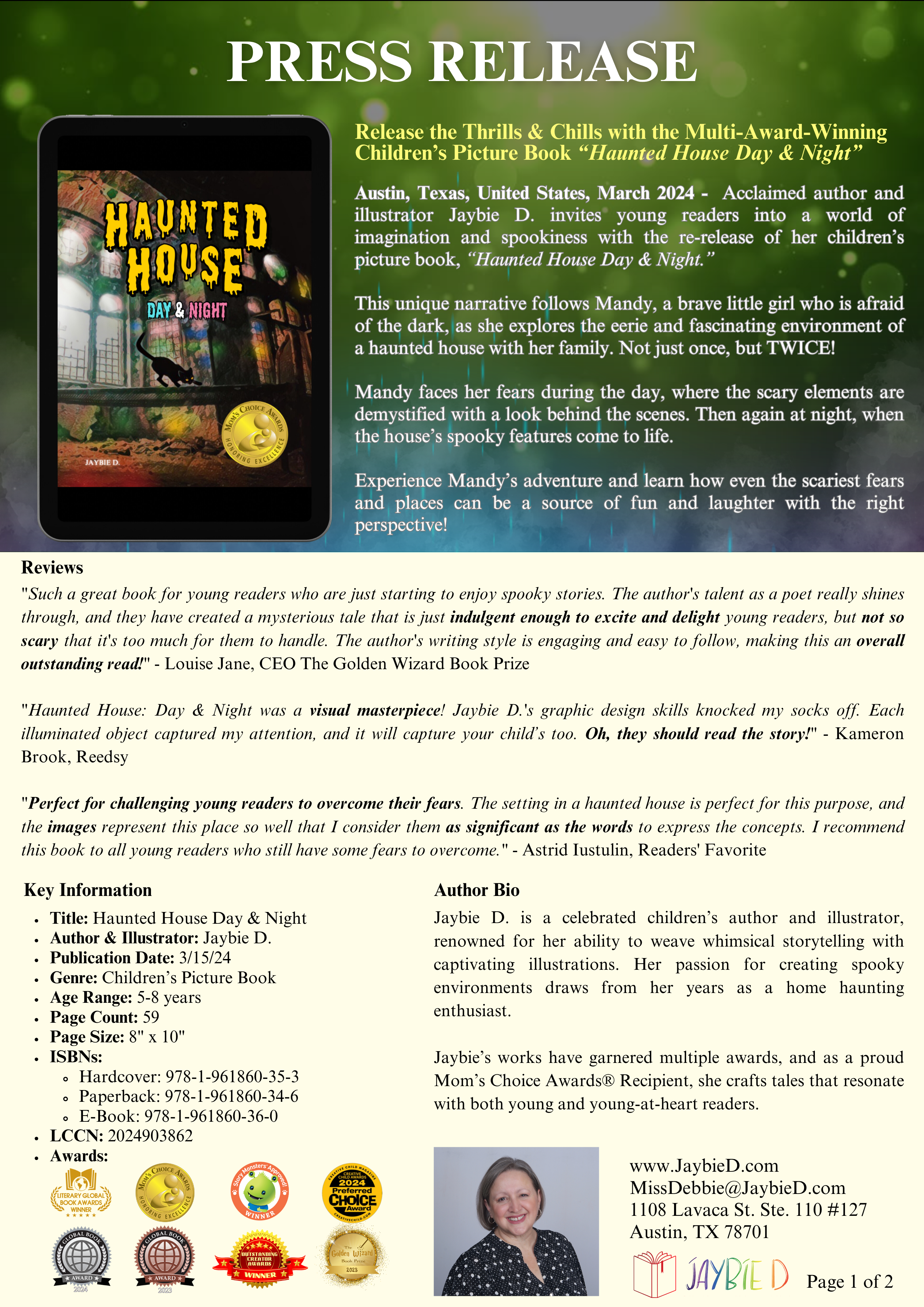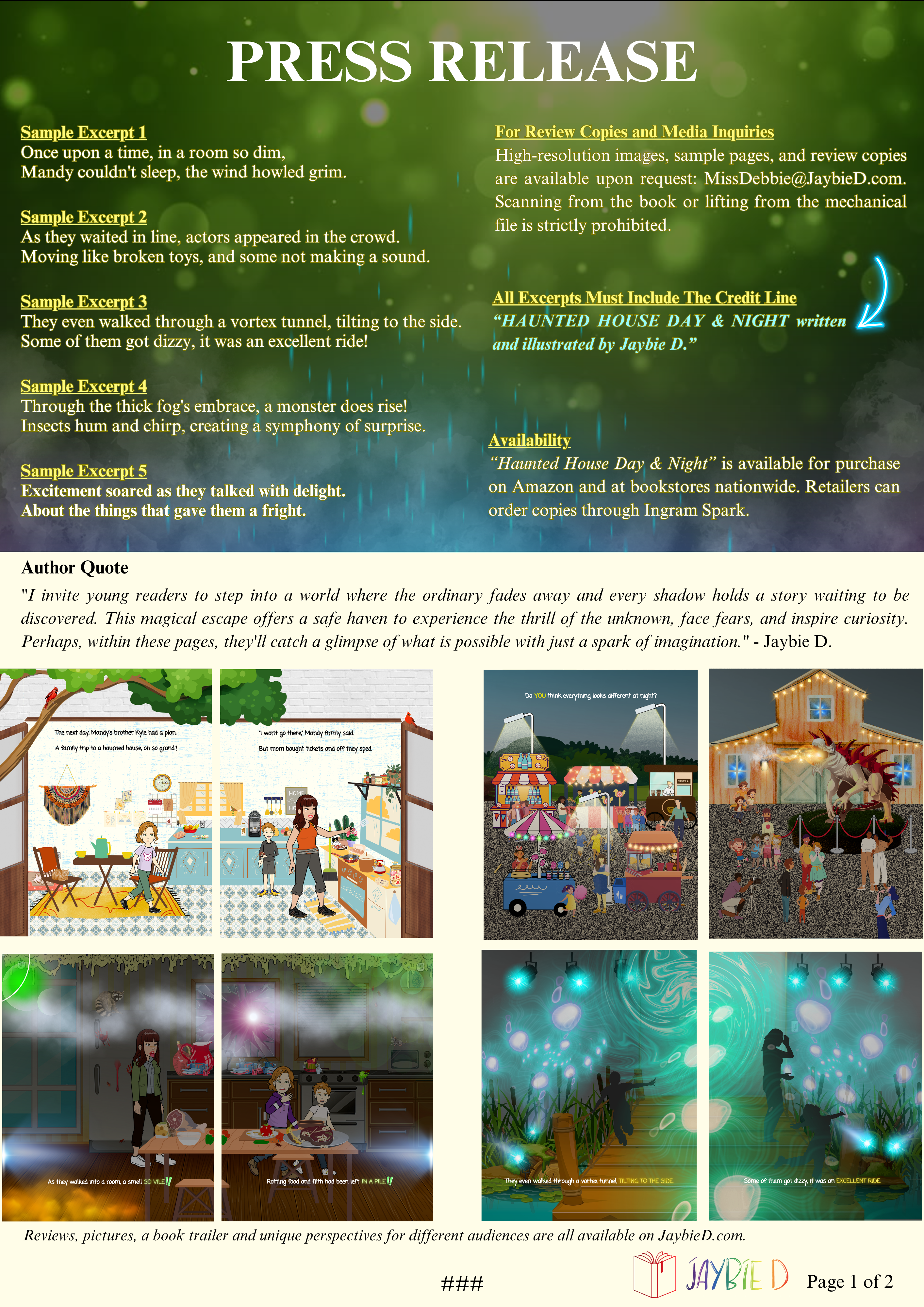 Haunted House: Day & Night was a visual masterpiece! Jaybie D.'s graphic design skills knocked my socks off. Each illuminated object captured my attention, and it will capture your child’s too. Oh, they should read the story!