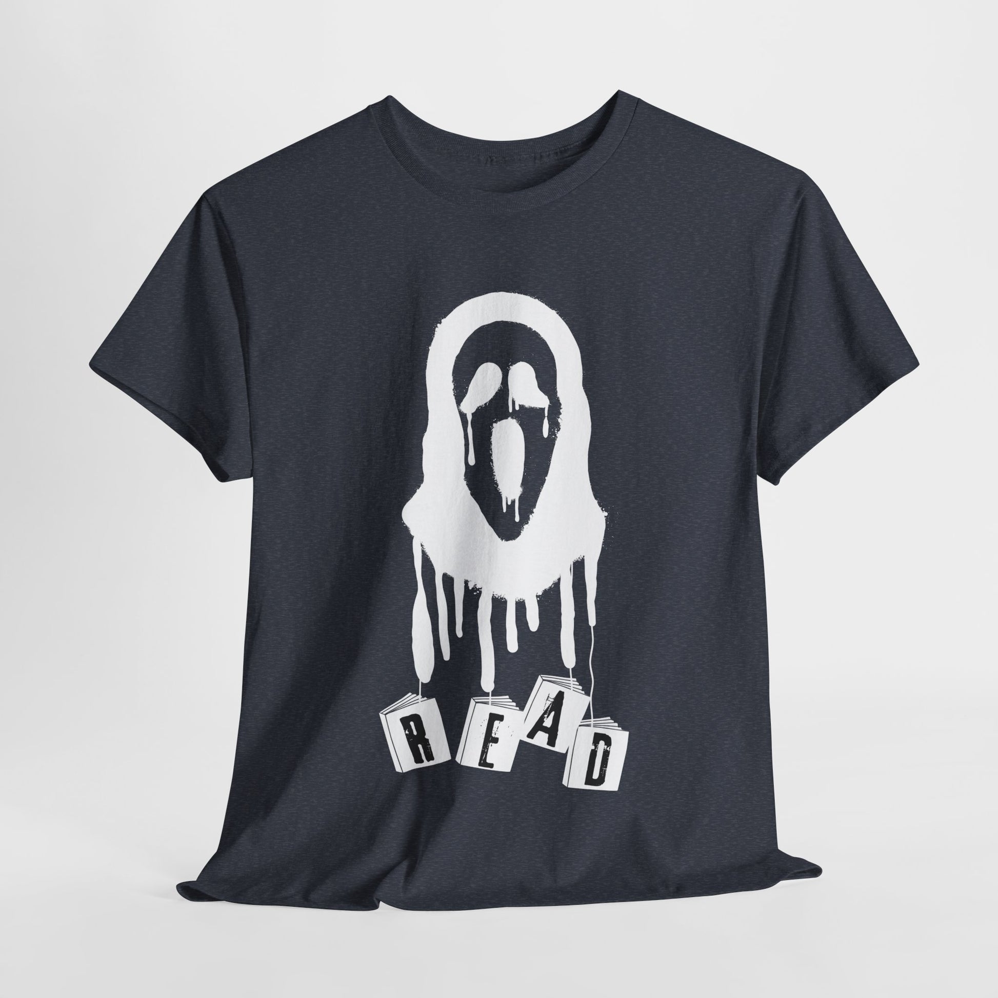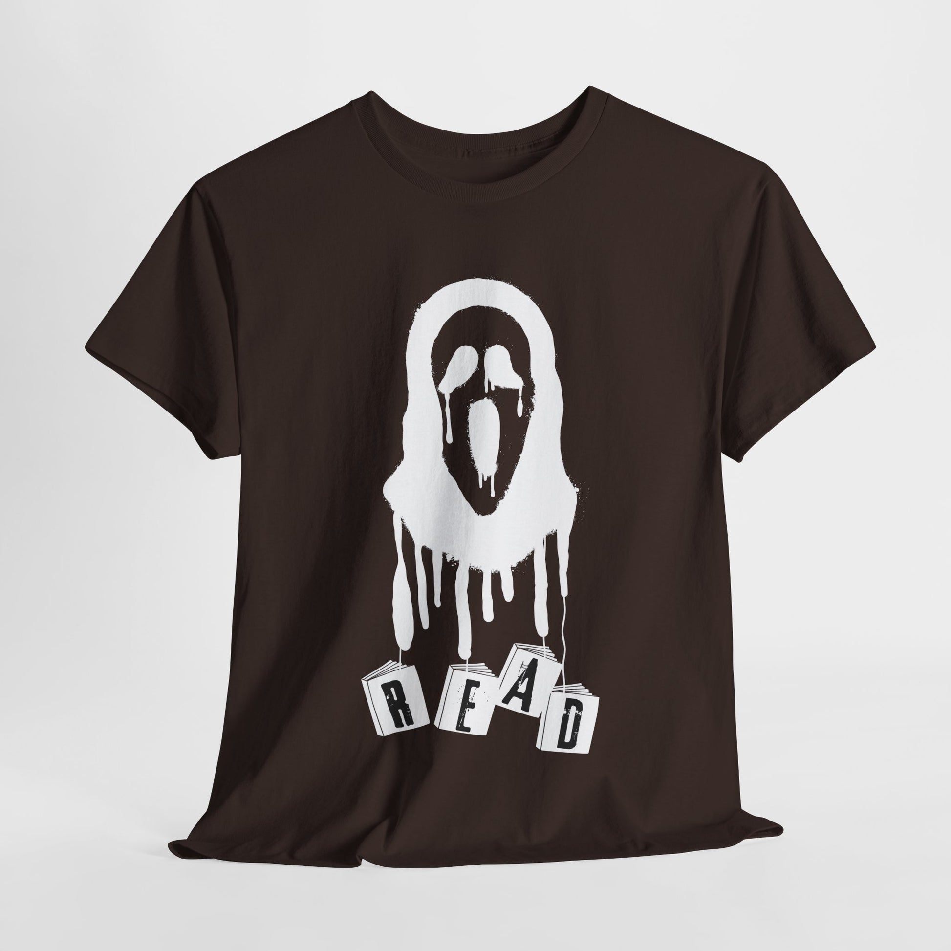 Teen/Adult Unisex Horror Mask READ T-Shirt – Creepy Book Lover Graphic Tee