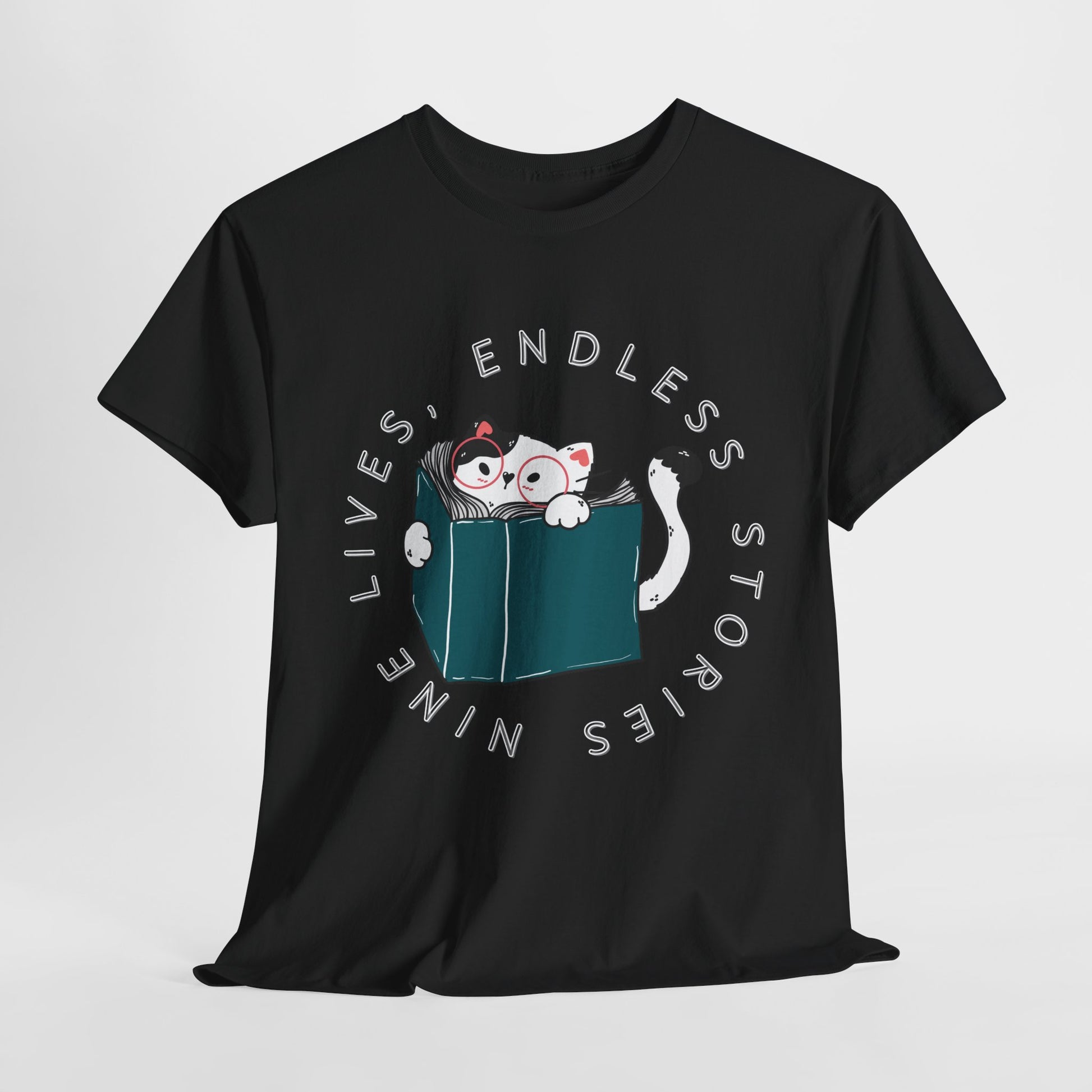 Teen/Adult Unisex "Nine Lives, Endless Stories" Cat & Book Graphic T-Shirt – Fun Reader Gift Tee