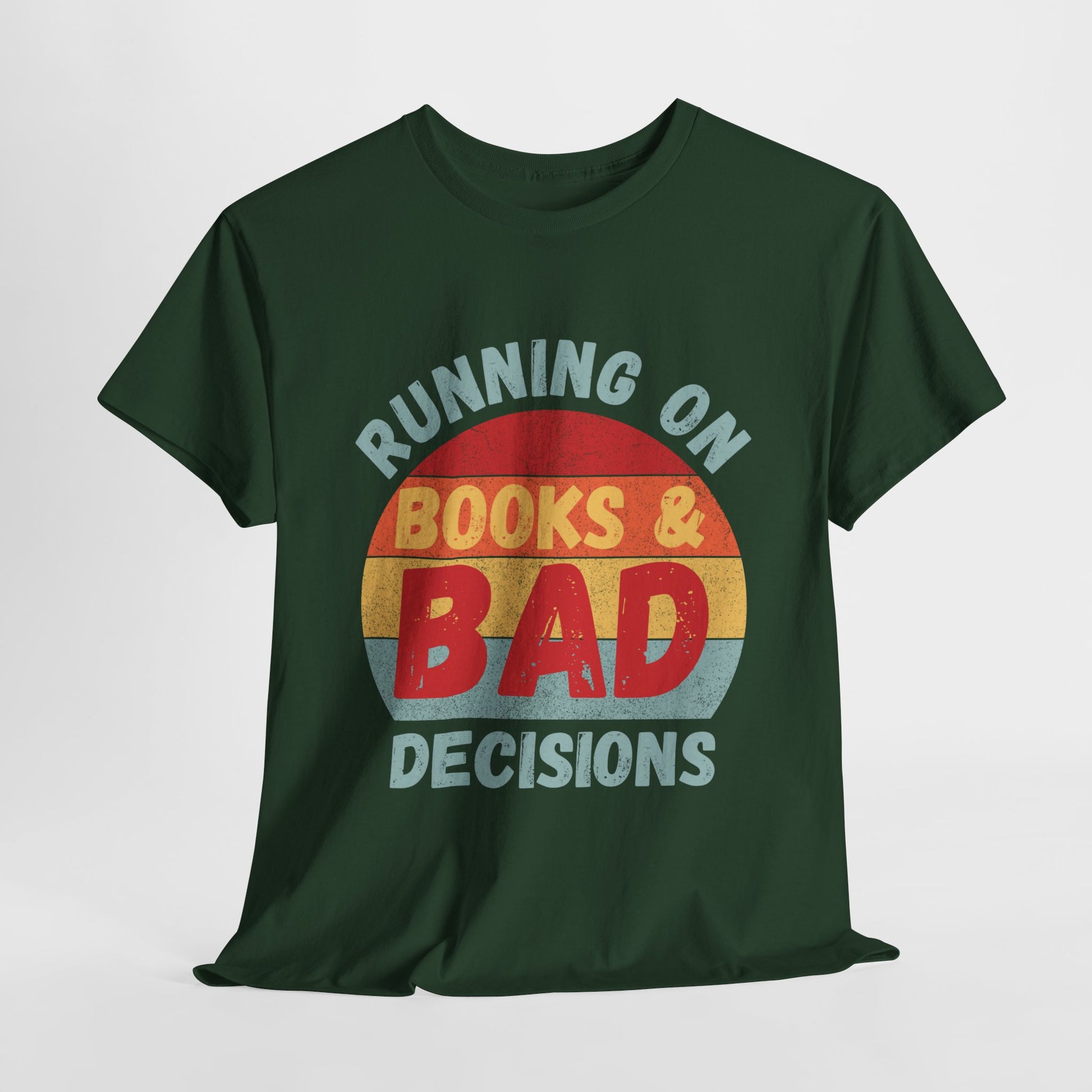 Teen/Adult Unisex Running on Books & Bad Decisions Tee – Funny Retro Reader Shirt for Book Addicts (Curve Edition)