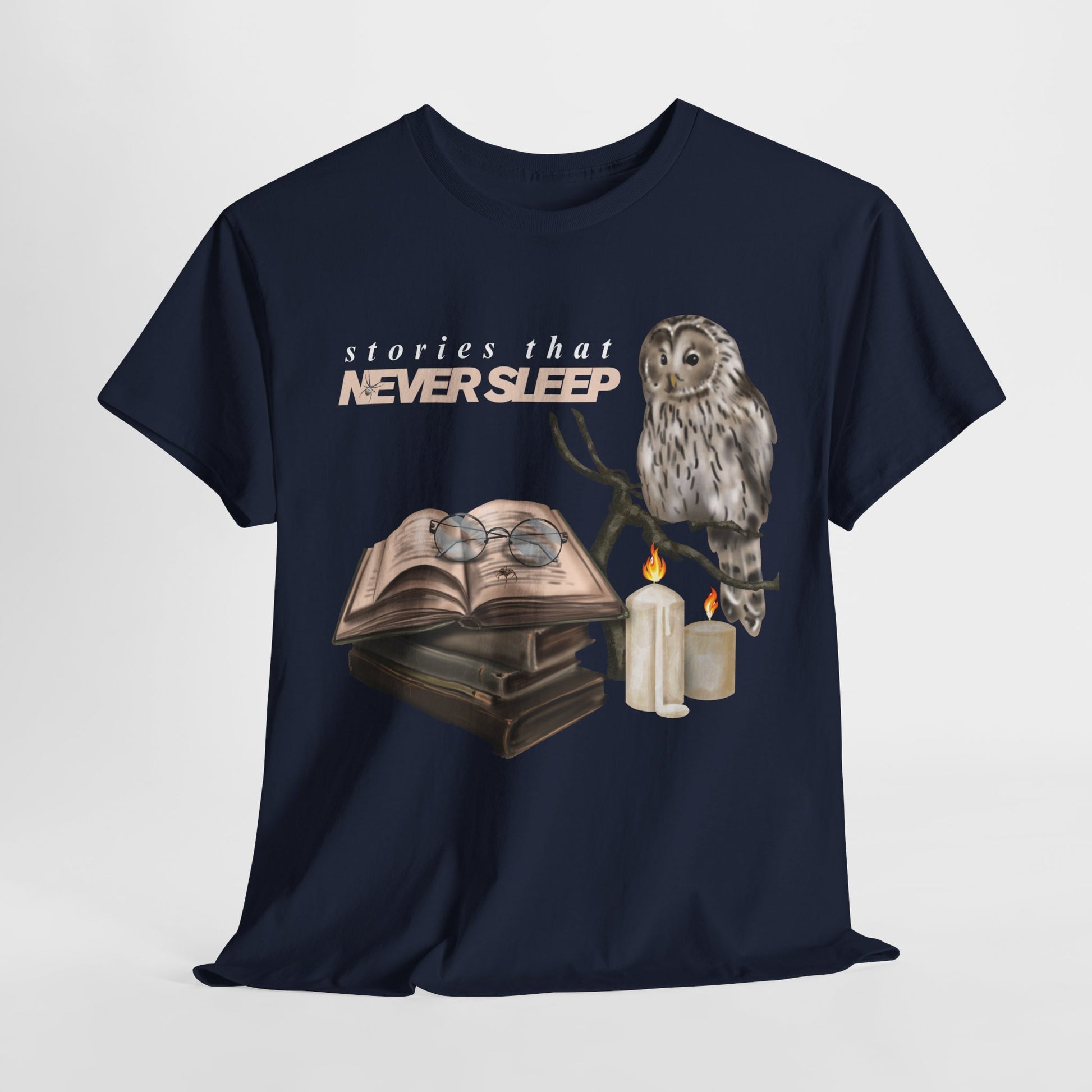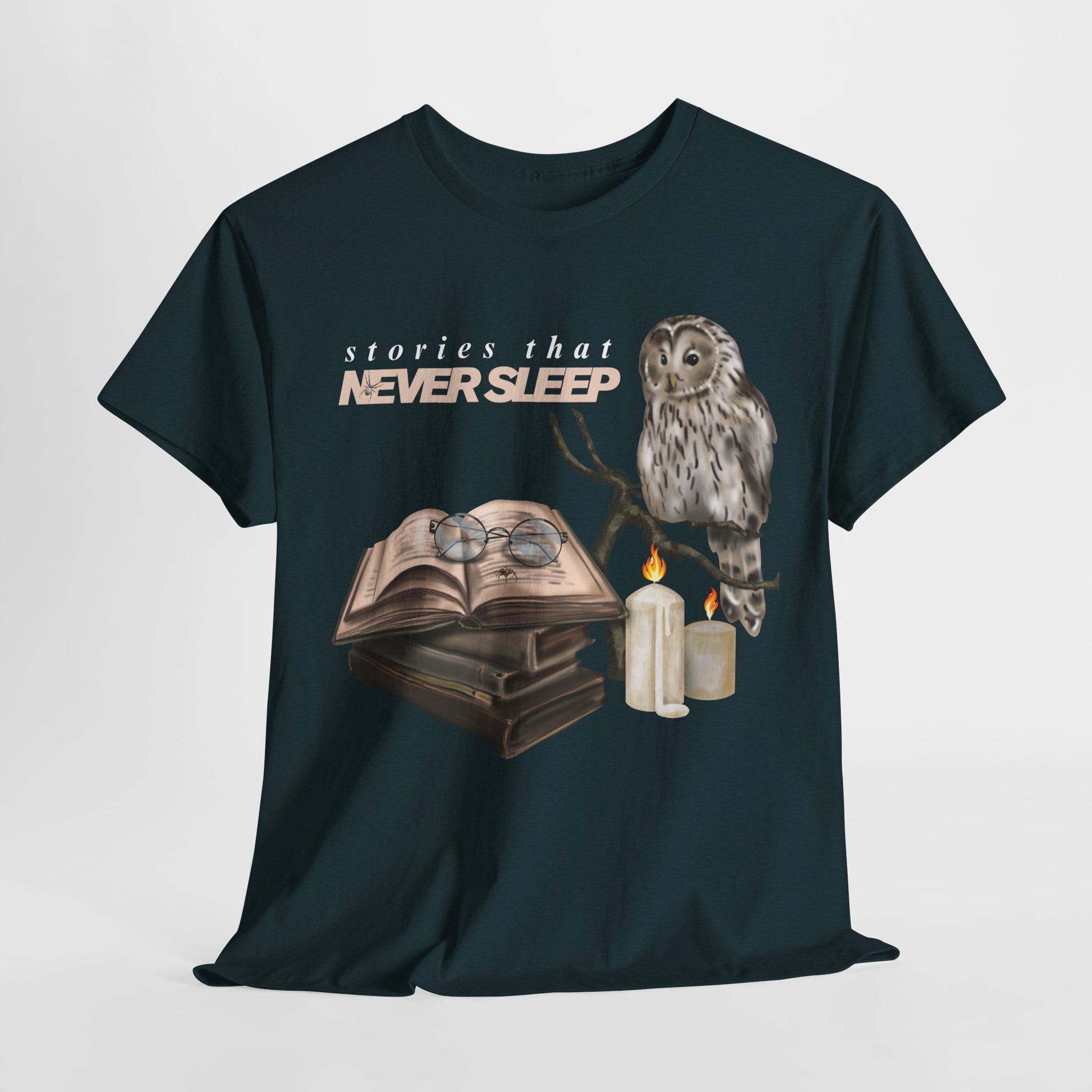📖🦉 A perfect pick for late-night readers, this enchanting tee features an owl perched by glowing candles beside an open book with glasses, under the phrase "Stories That Never Sleep." Whether you’re a night owl lost in a good novel or someone who finds comfort in pages past bedtime, this shirt captures the quiet magic of reading long after the world has gone to bed. ✨