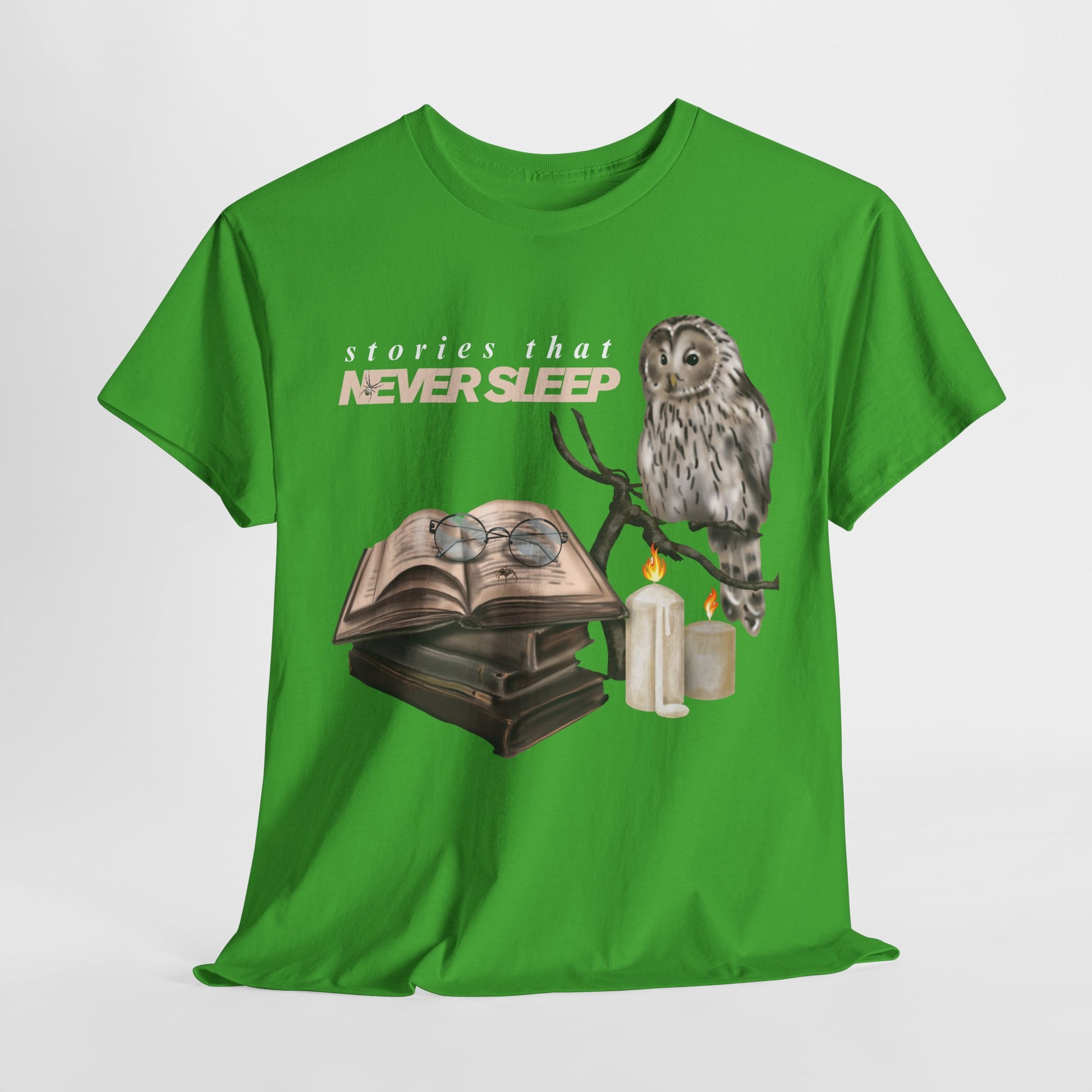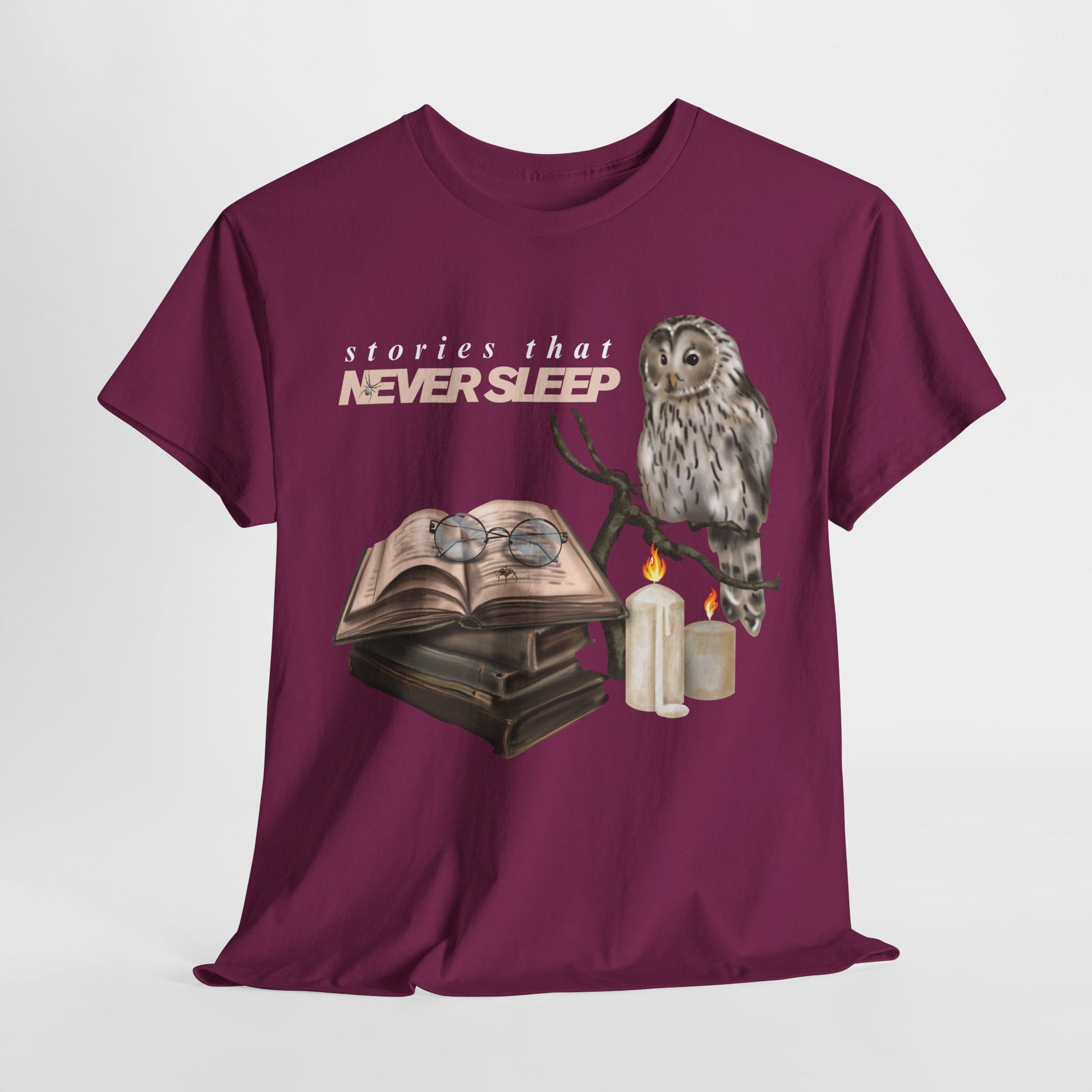 Teen/Adult Unisex "Stories That Never Sleep" Owl & Candlelight Book T-Shirt – Cozy Night Reader Tee