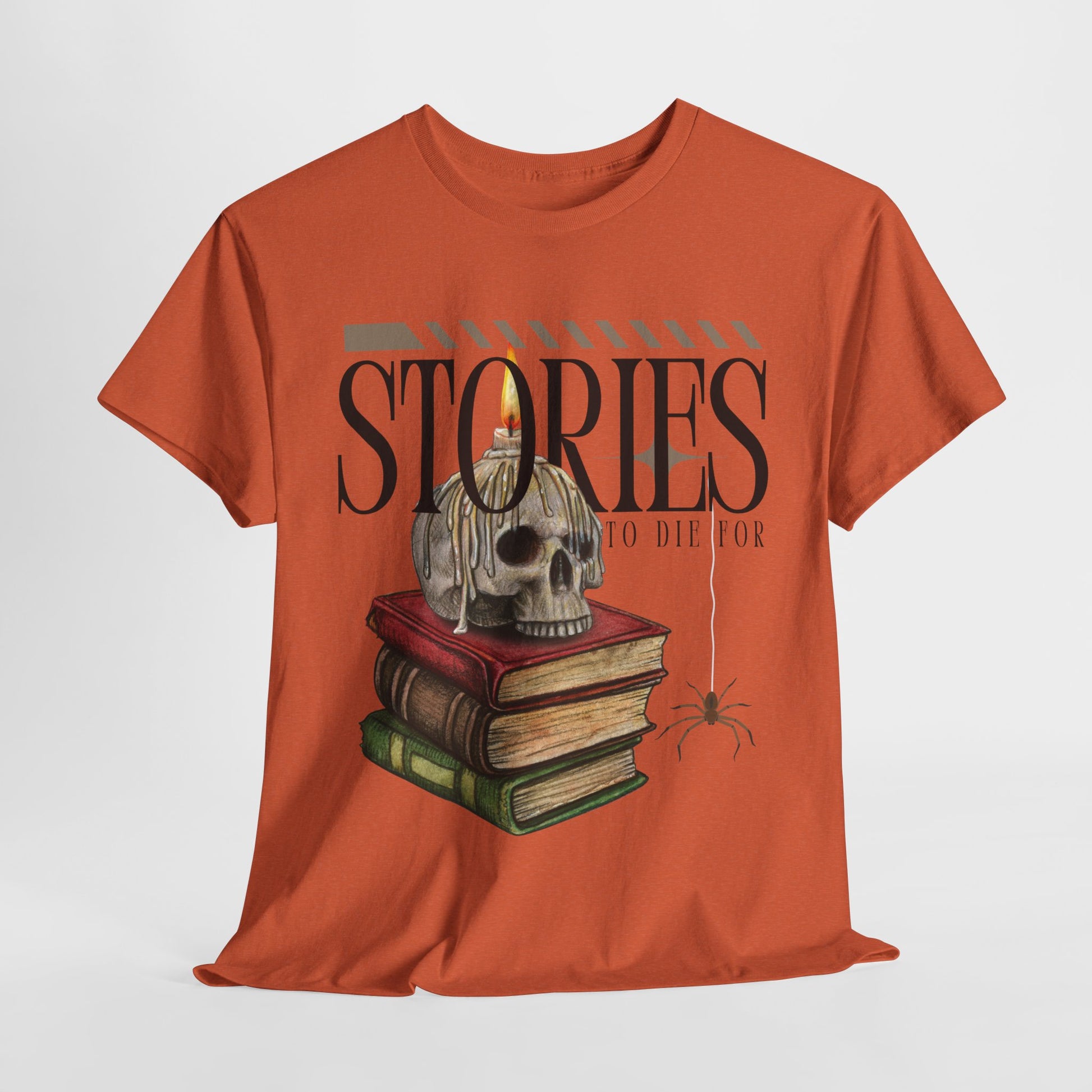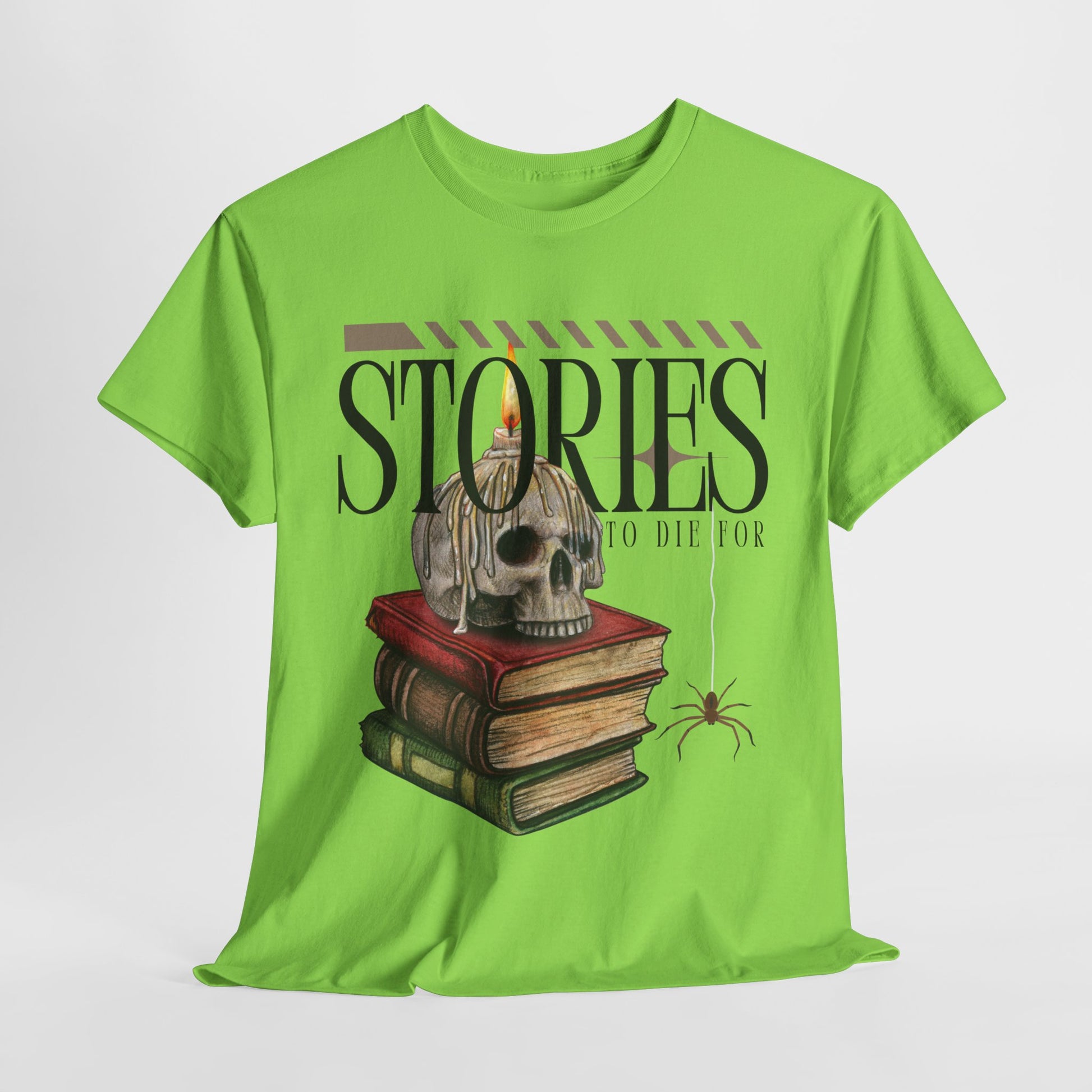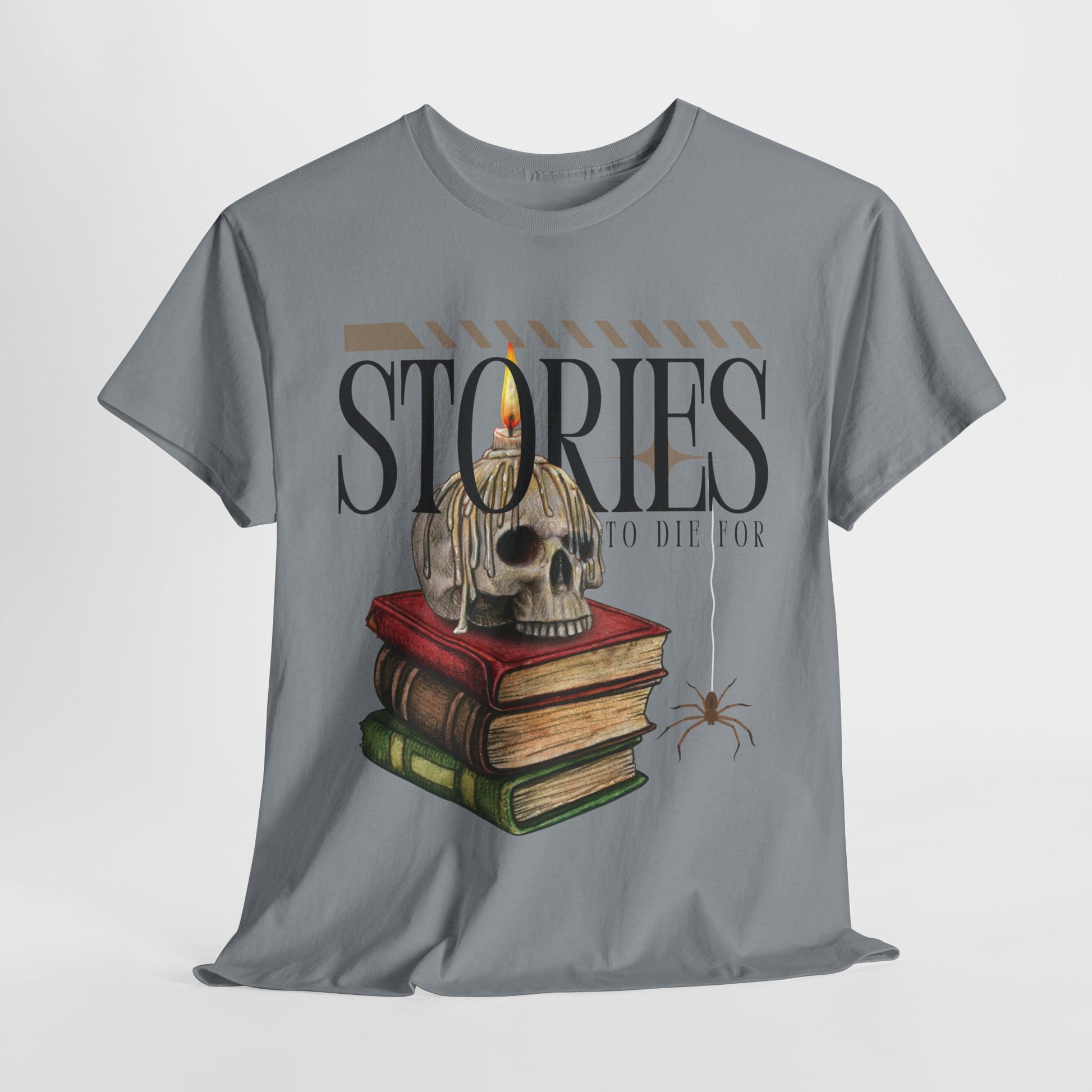 Teen/Adult Unisex Stories to Die For T-Shirt – Skull & Books Horror Reader Tee