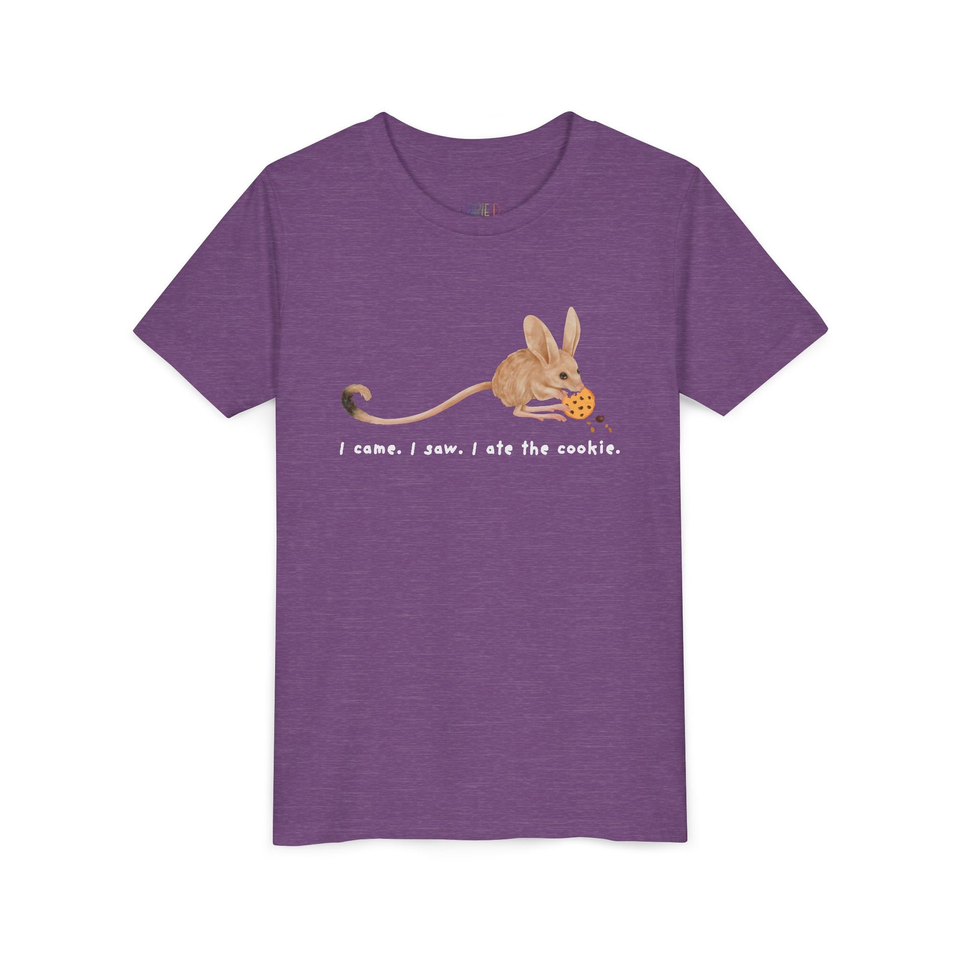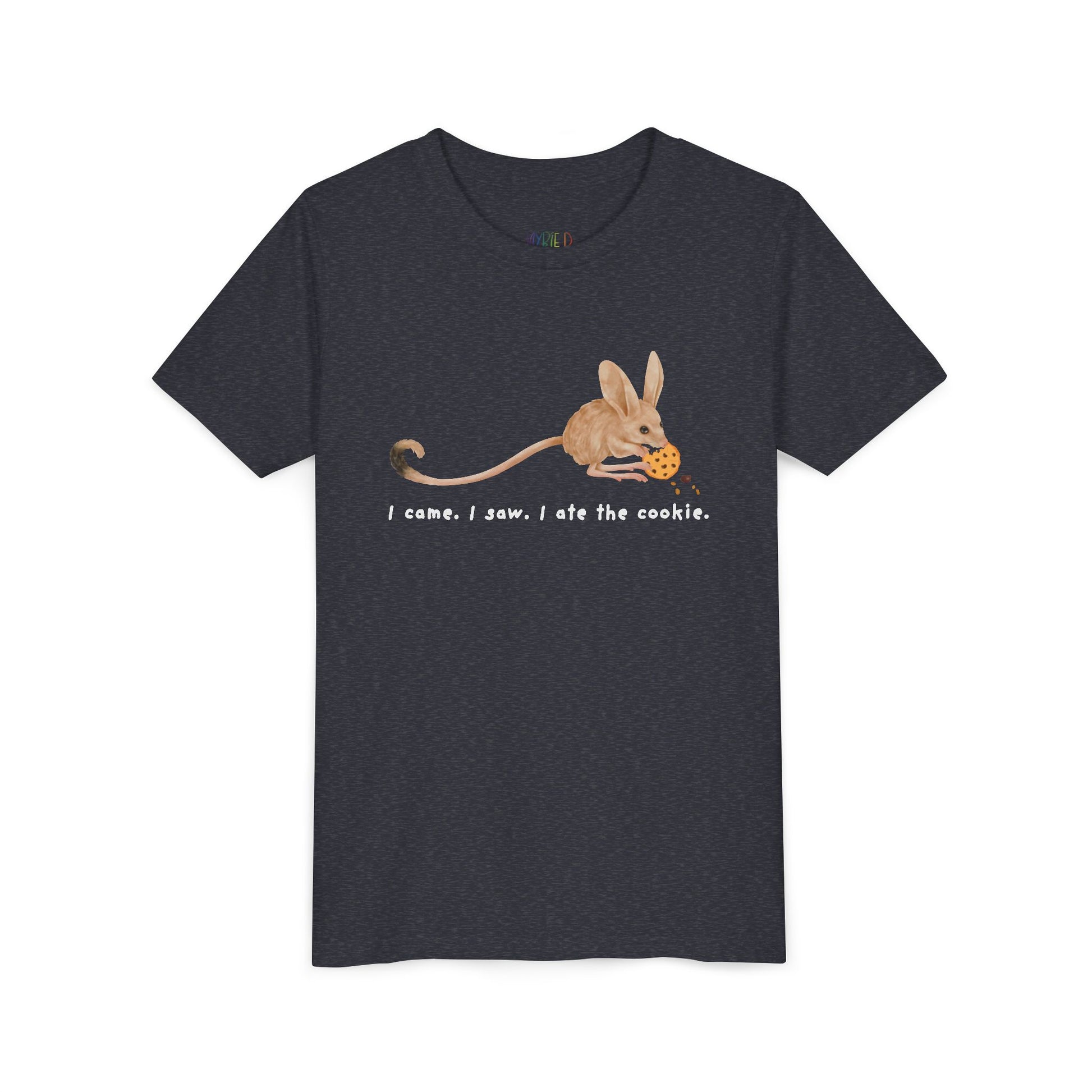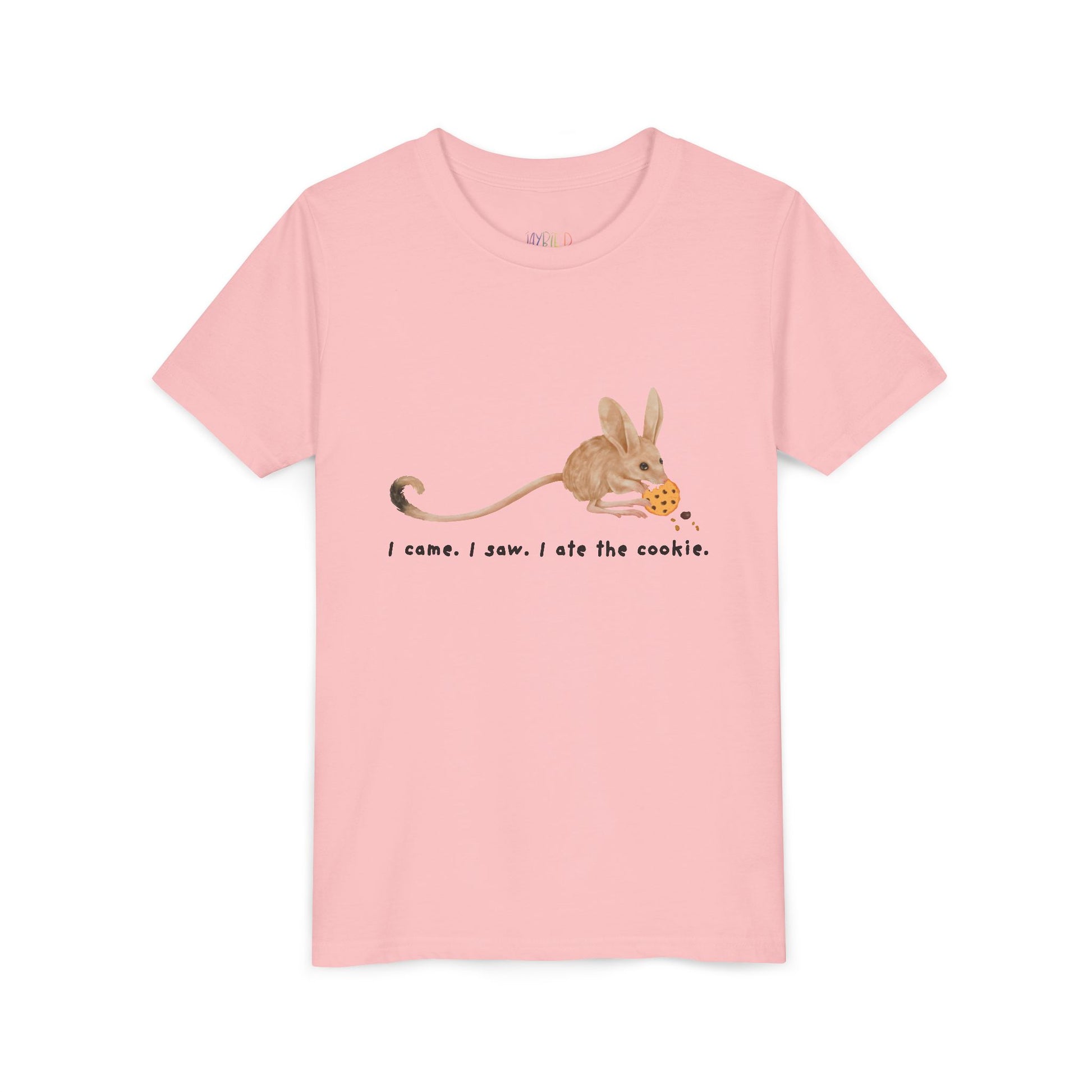 Bold. Fast. Crumb-covered. This hilariously honest tee features an adorable jerboa with a mission—and a cookie. Whether your kid is a stealthy snack snatcher or just loves animals with big ears and bigger appetites, this shirt delivers giggles with every wear.
