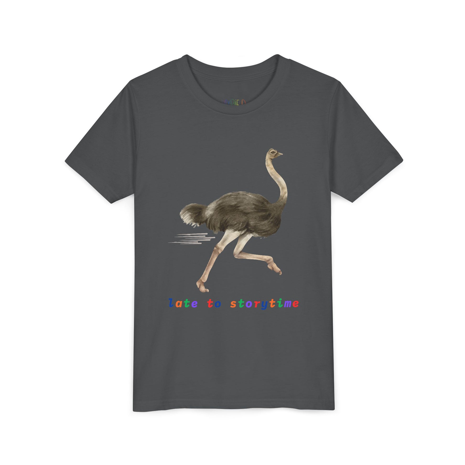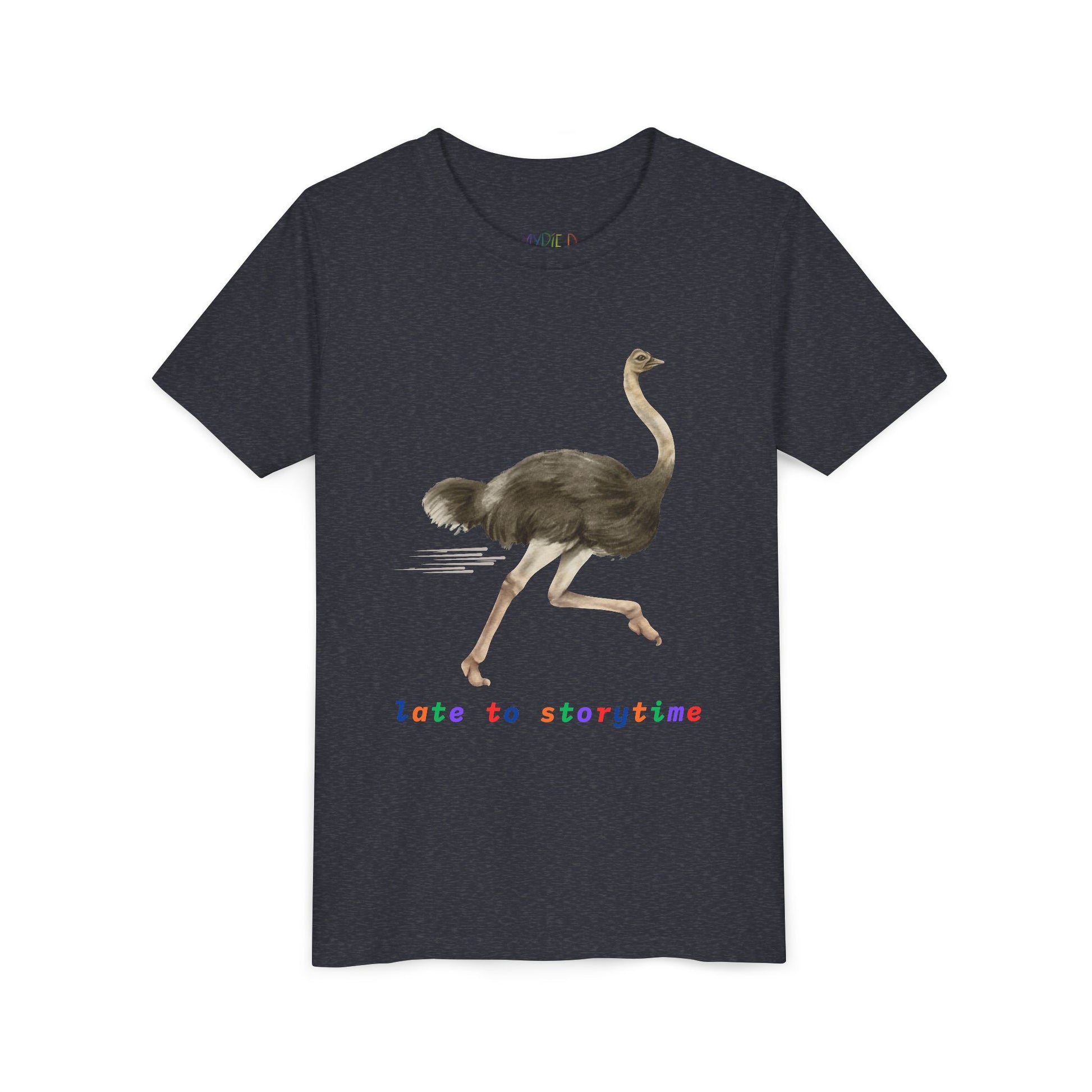Youth Late to Storytime Tee – Funny Ostrich Shirt for Bookish Speedsters