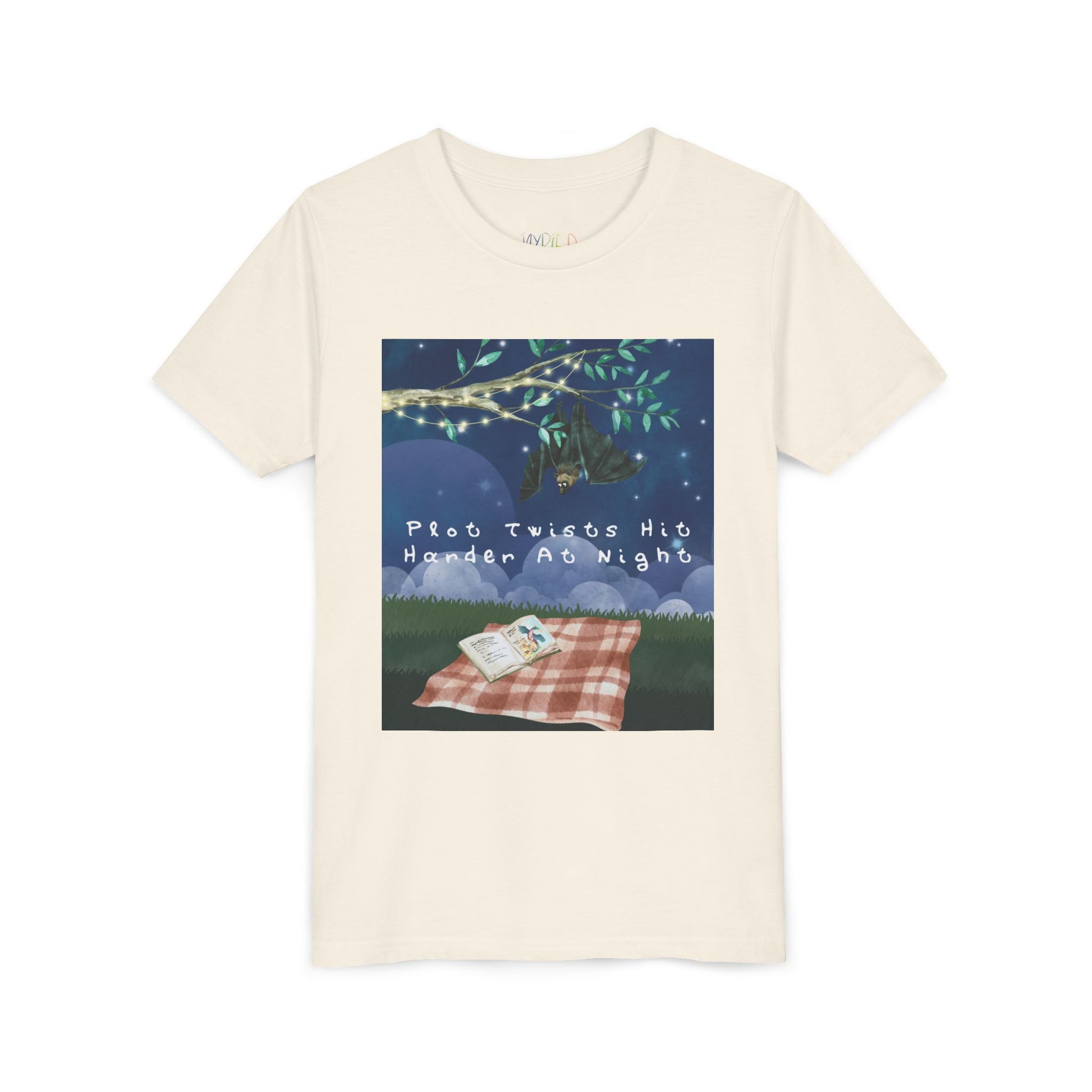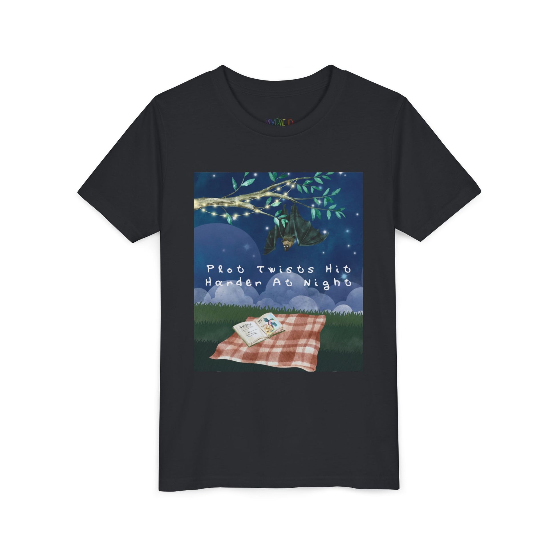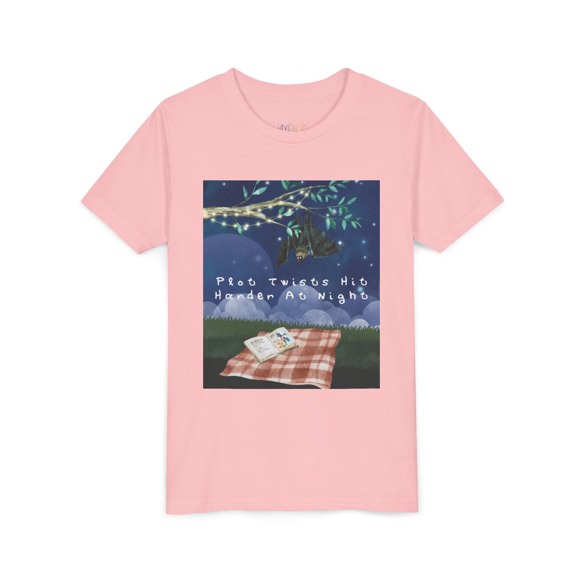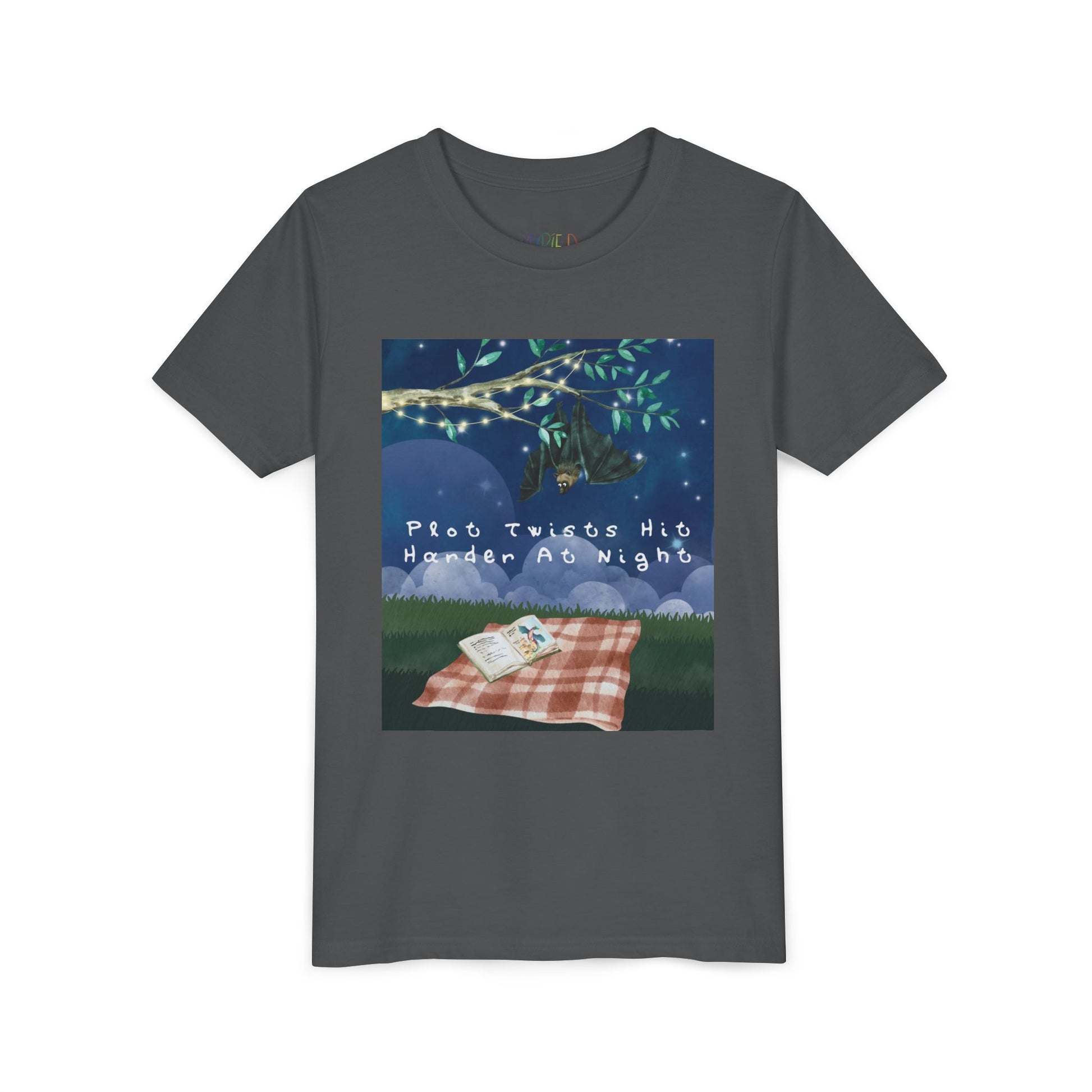 Youth Plot Twists Hit Harder at Night Tee β Spooky Bat Shirt for Bedtime Readers