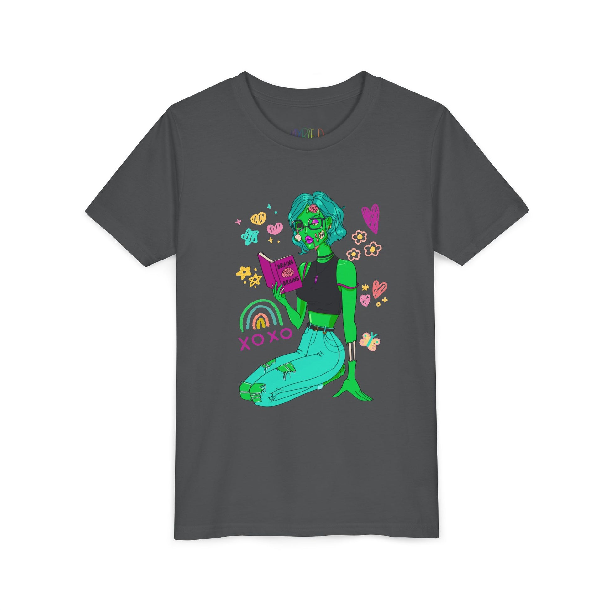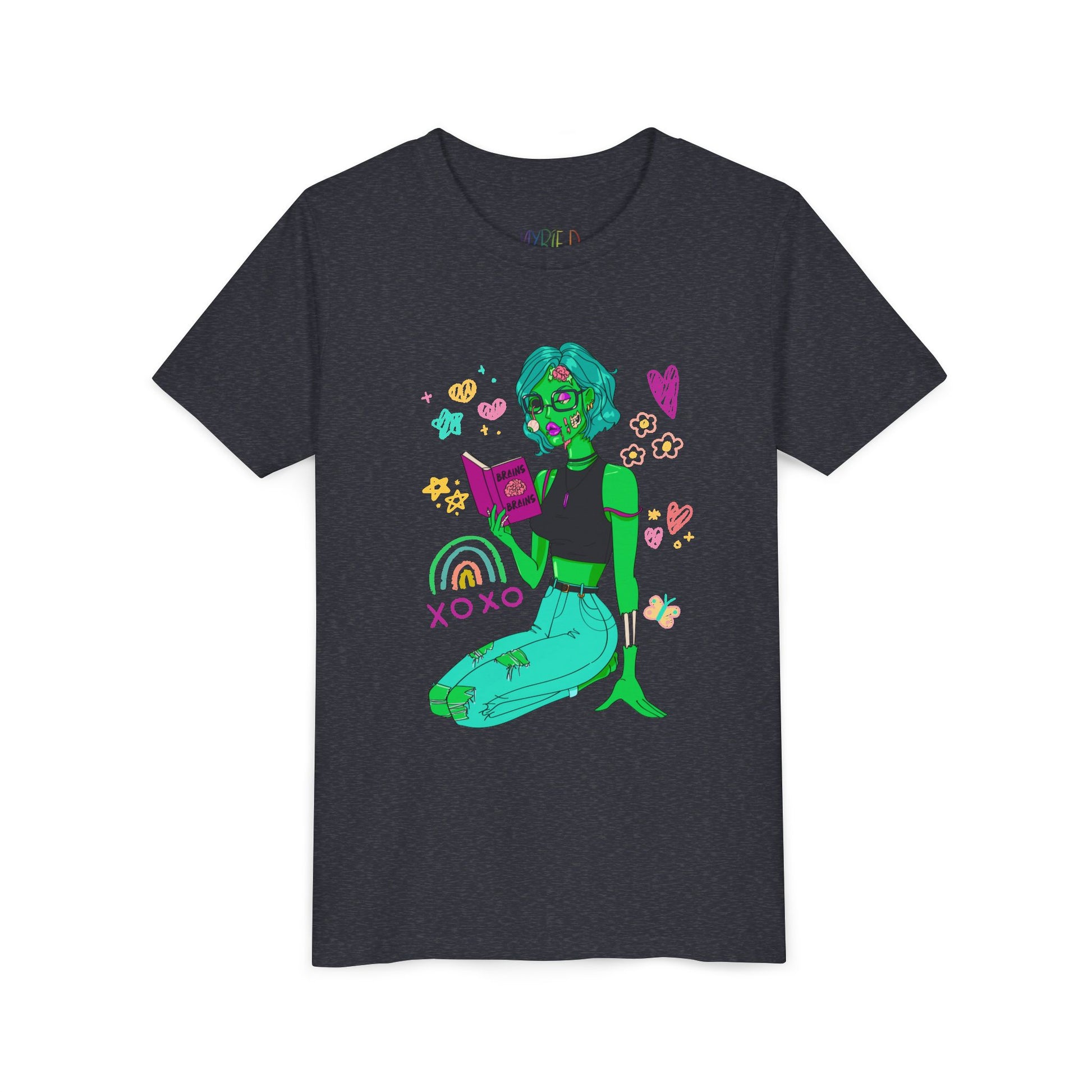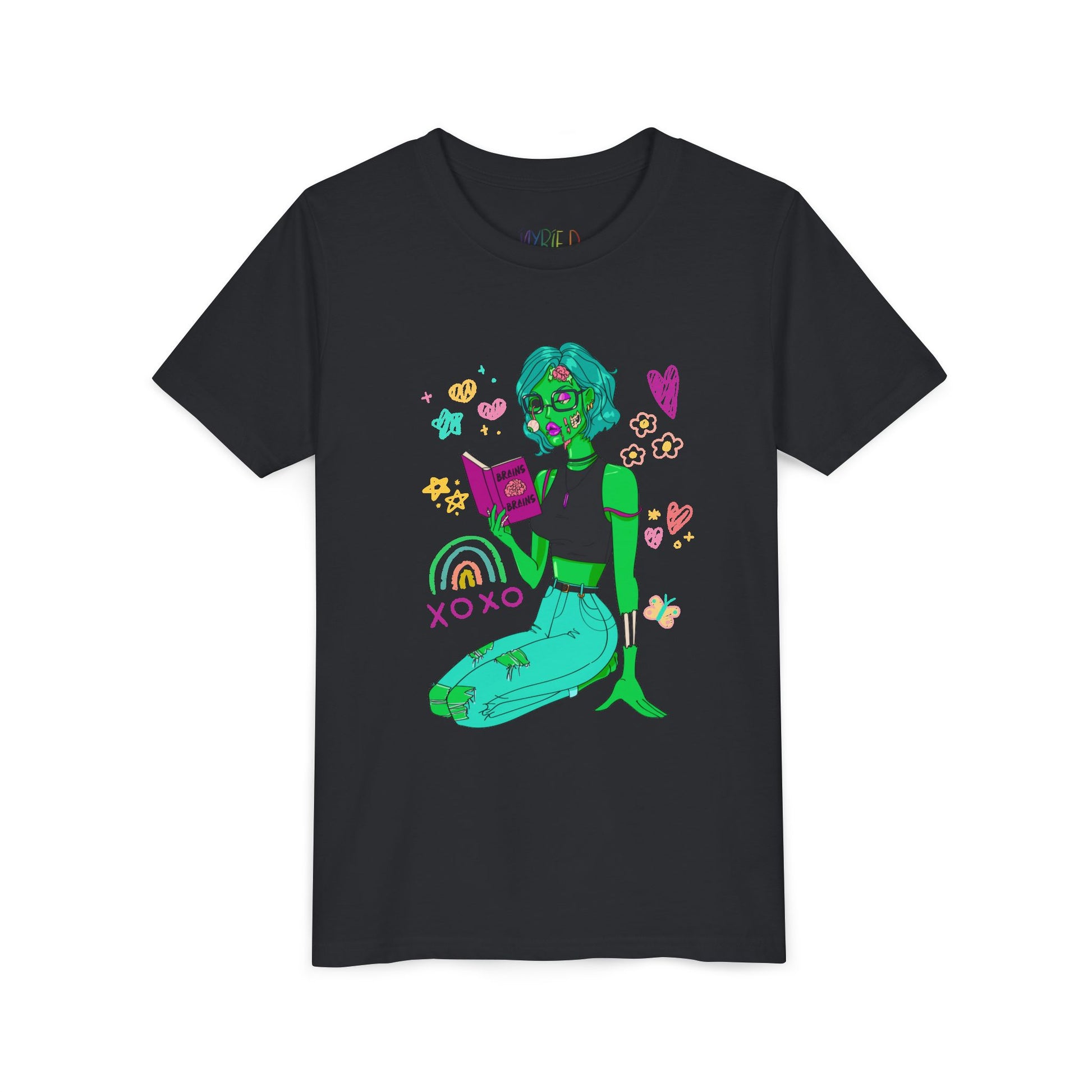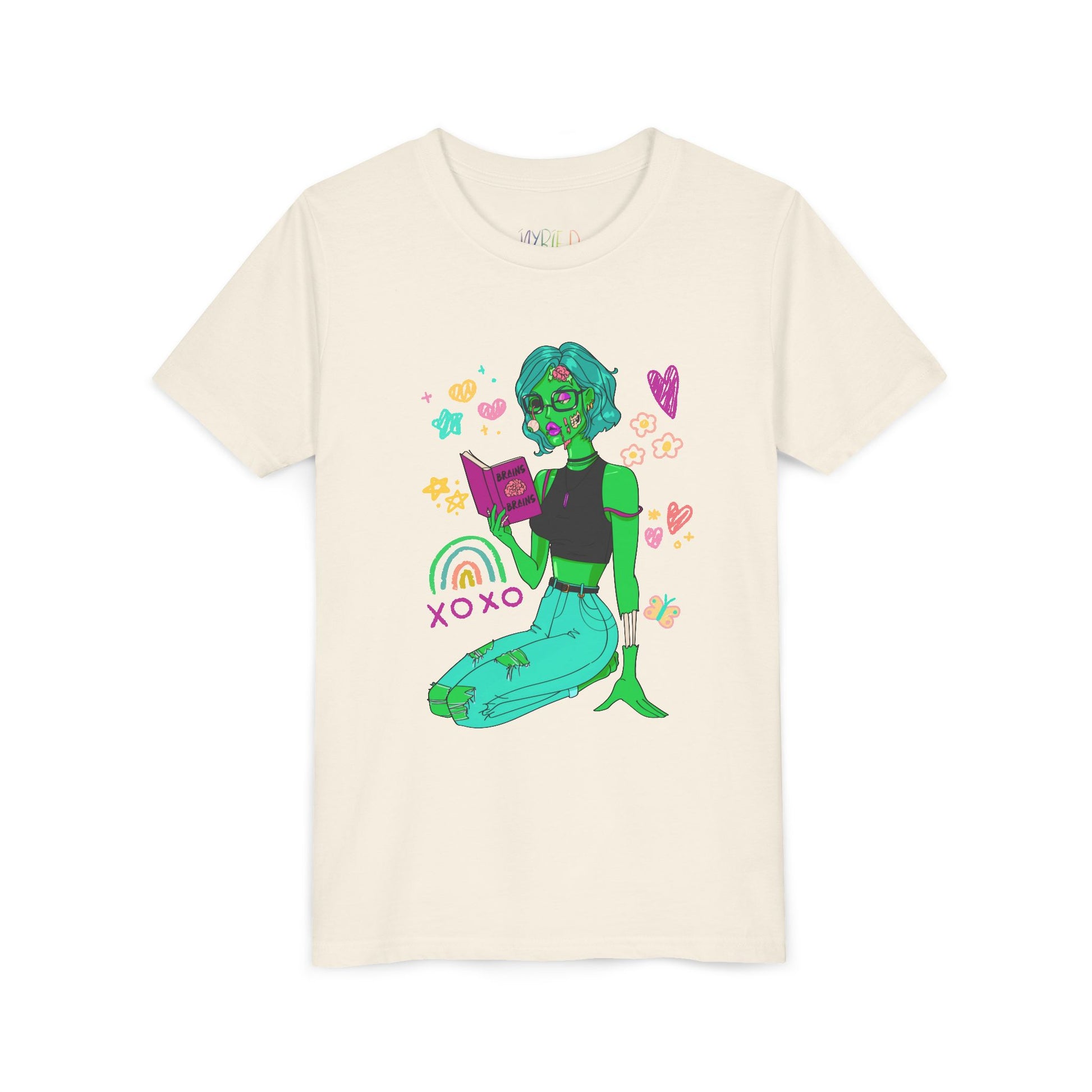 ✨ A bold and artsy pick for young readers with an edge! This graphic tee features a neon-green zombie girl cozied up with her favorite book, surrounded by doodled stars, hearts, butterflies, and a rainbow. Perfect for kids who love spooky vibes, playful fashion, and showing off their love for stories. Great for Halloween season or year-round reading fun! 📚💚👻